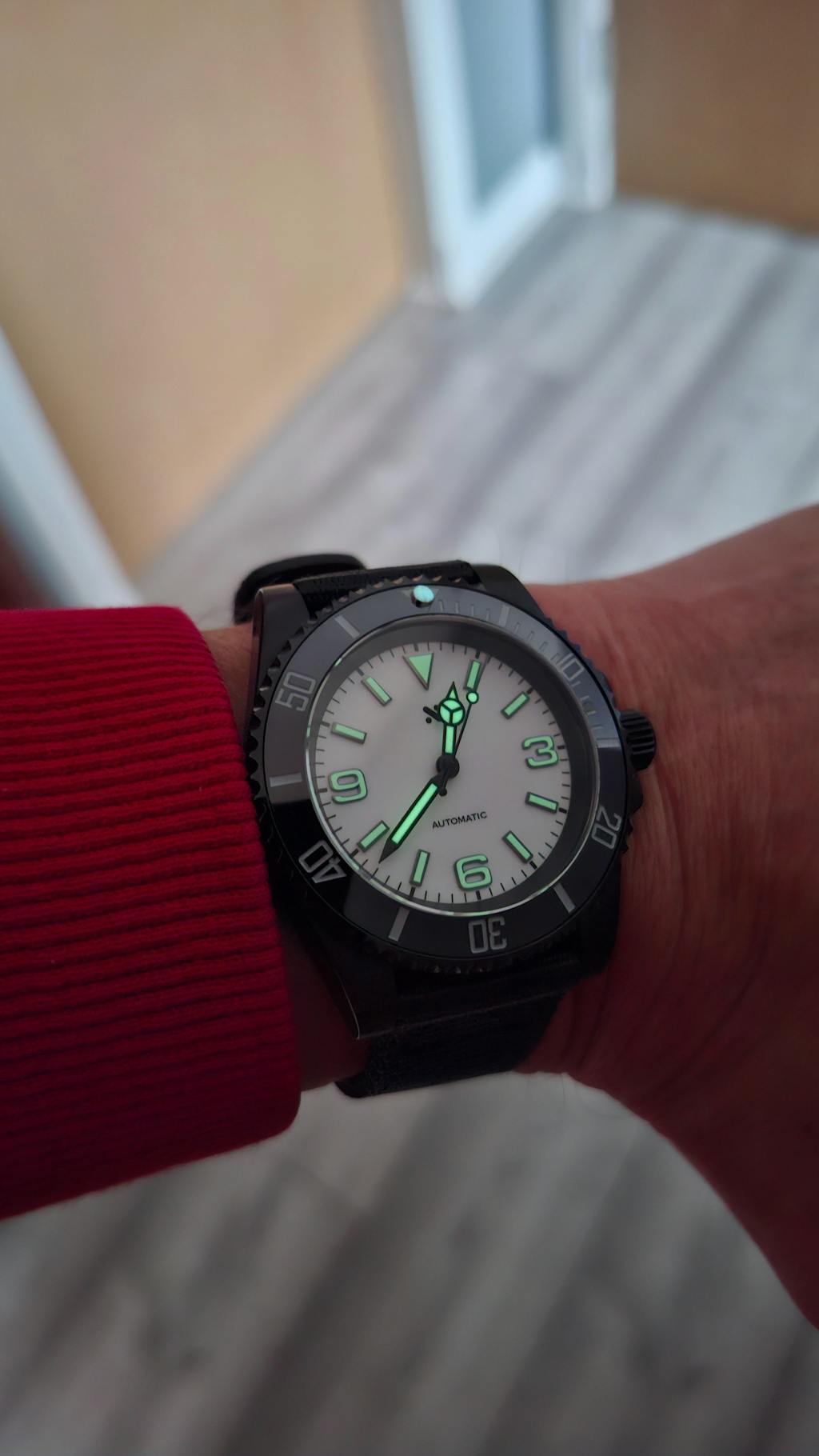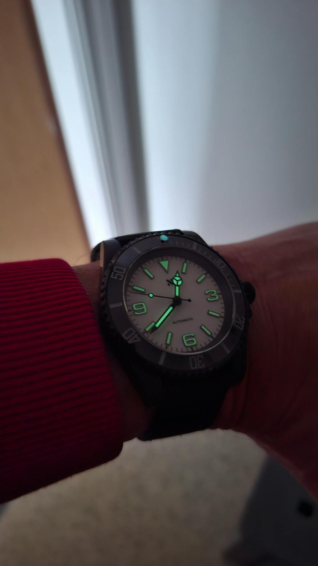 Our Vintage DiveMaster dial is filled with a creamy, patina lume that pairs perfectly with our range of vintage patina lume hands.