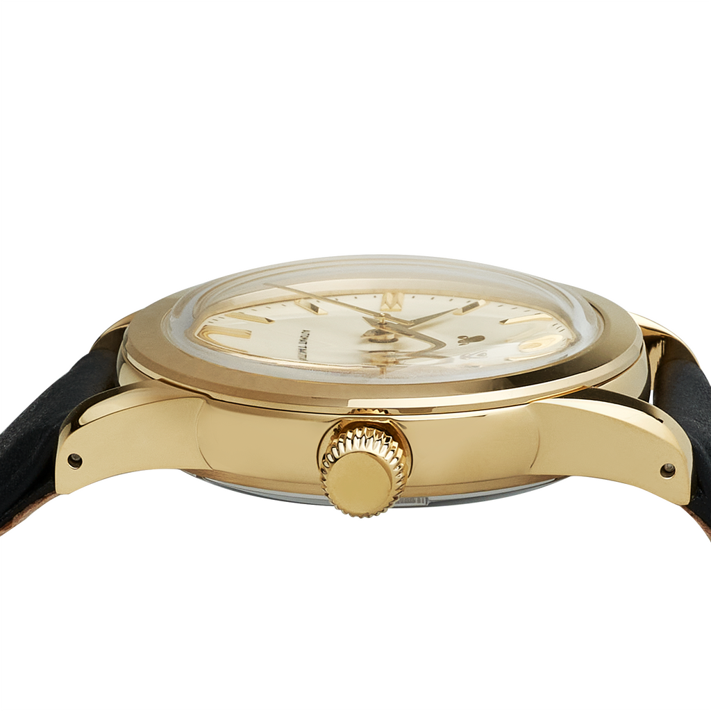 The NMK16 Automatic Dress Watch: GS Gold exudes vintage charm and refined sophistication. Inspired by vintage dress watches with details such as a top hat box crystal, full polished body and a petite, 37mm size, this watch is perfect for those weddings and formal events.