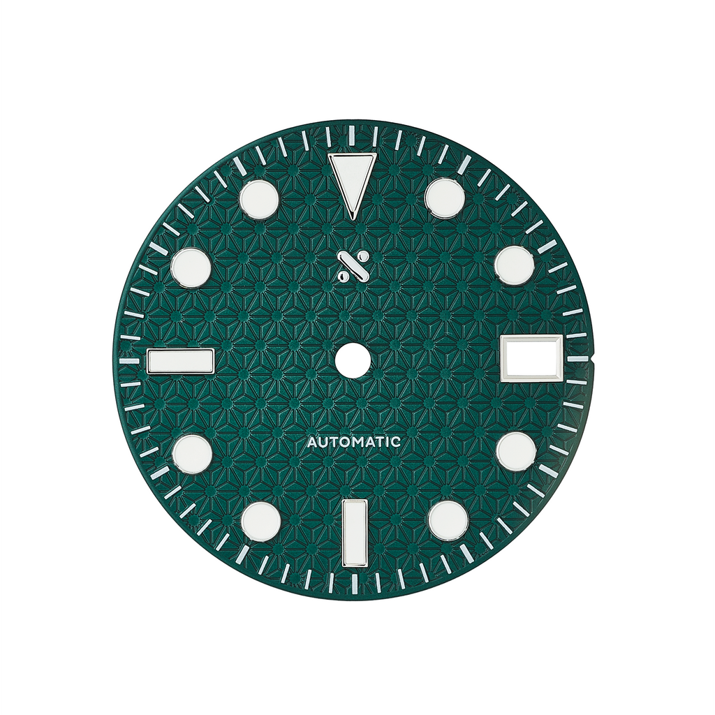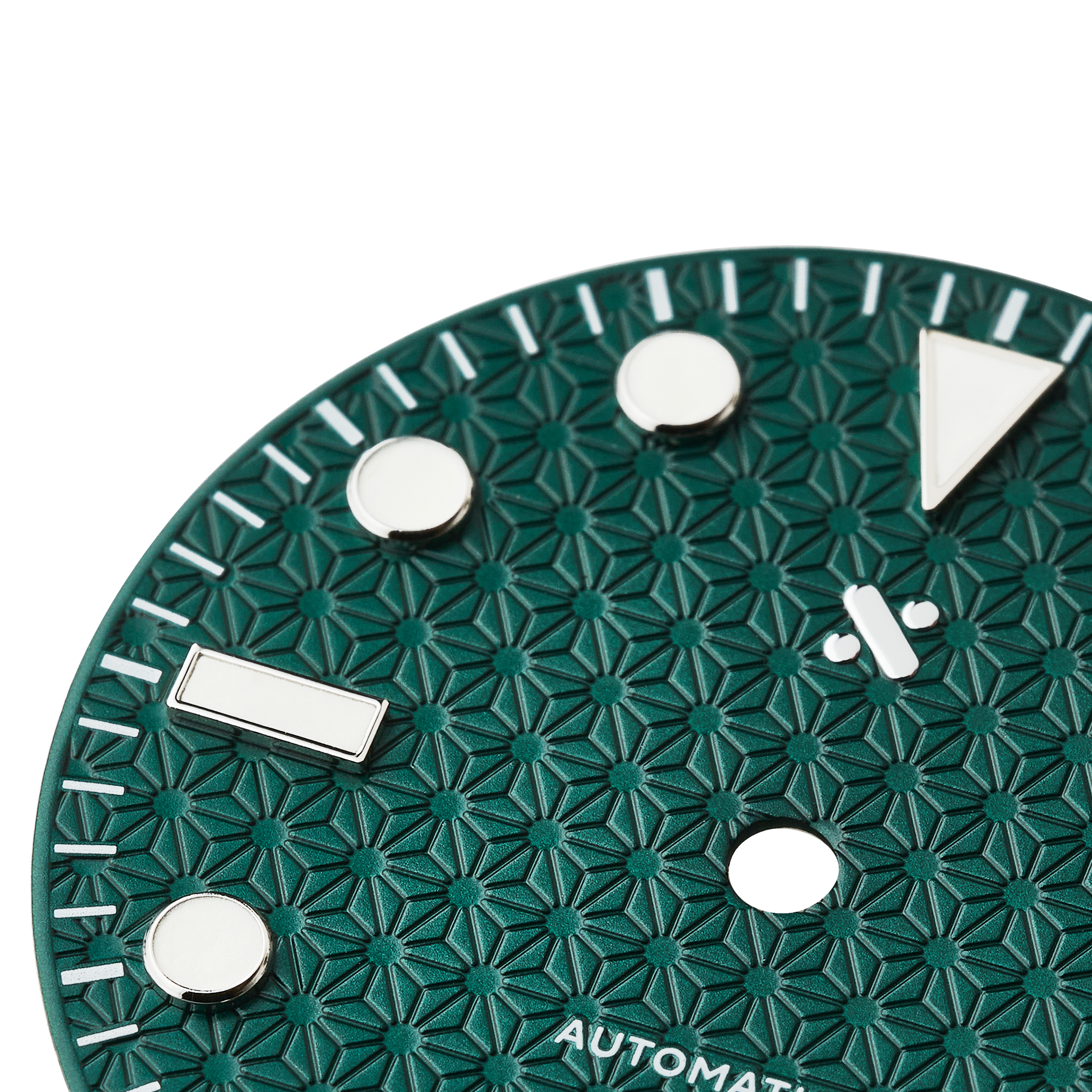 The Asanoha dial is filled with C3 Super-LumiNova® Lume. C3 Super-LumiNova Lume is the brightest of all lume colours, topping the Super-LumiNova table at 100% relative brightness and giving off a bright, green glow that typically lasts for 7 to 10 hours. It will match the stock Seiko LumiBrite hands and any of our watch hands options perfectly.