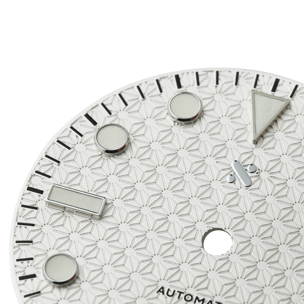 Inspired by traditional Japanese culture, the Asanoha Dial in Silver features the iconic hemp leaf pattern, symbolizing growth and resilience. The intricate details of the pattern create a subtle yet captivating visual effect, with clean lines that enhance the dial’s sophistication.
