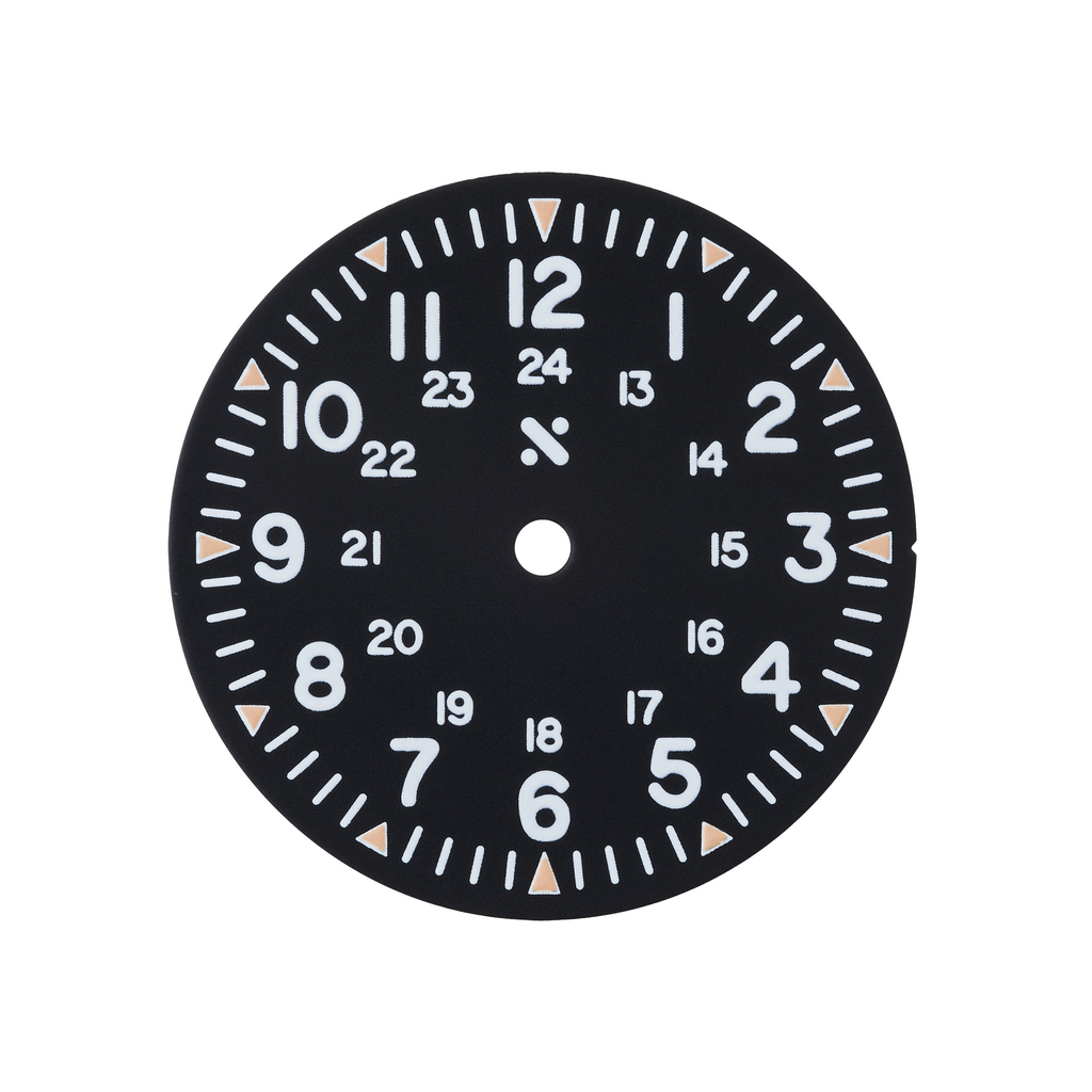 Dieses Zifferblatt ist mit einer speziellen Mischung aus gefüllt C3 Super-Luminova® Lume und Pigmente, um eine cremige, vintage-Lume-Farbe herzustellen. C3 Super-Luminova Lume ist der hellste aller Lume-Farben, der den Super-Luminova-Tisch bei 100% relativer Helligkeit trägt und einen hellen, grünen Glühen abgeben, der normalerweise 7 bis 10 Stunden dauert.