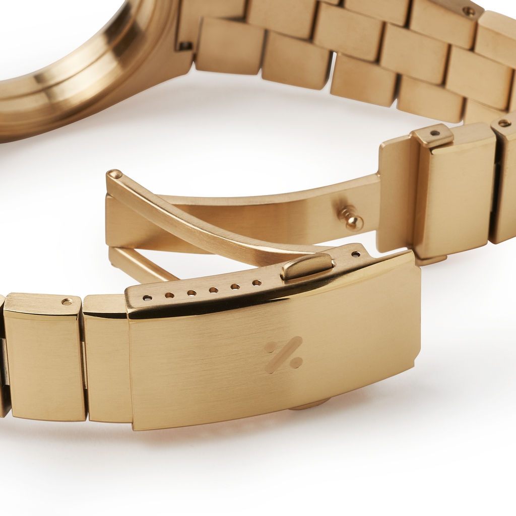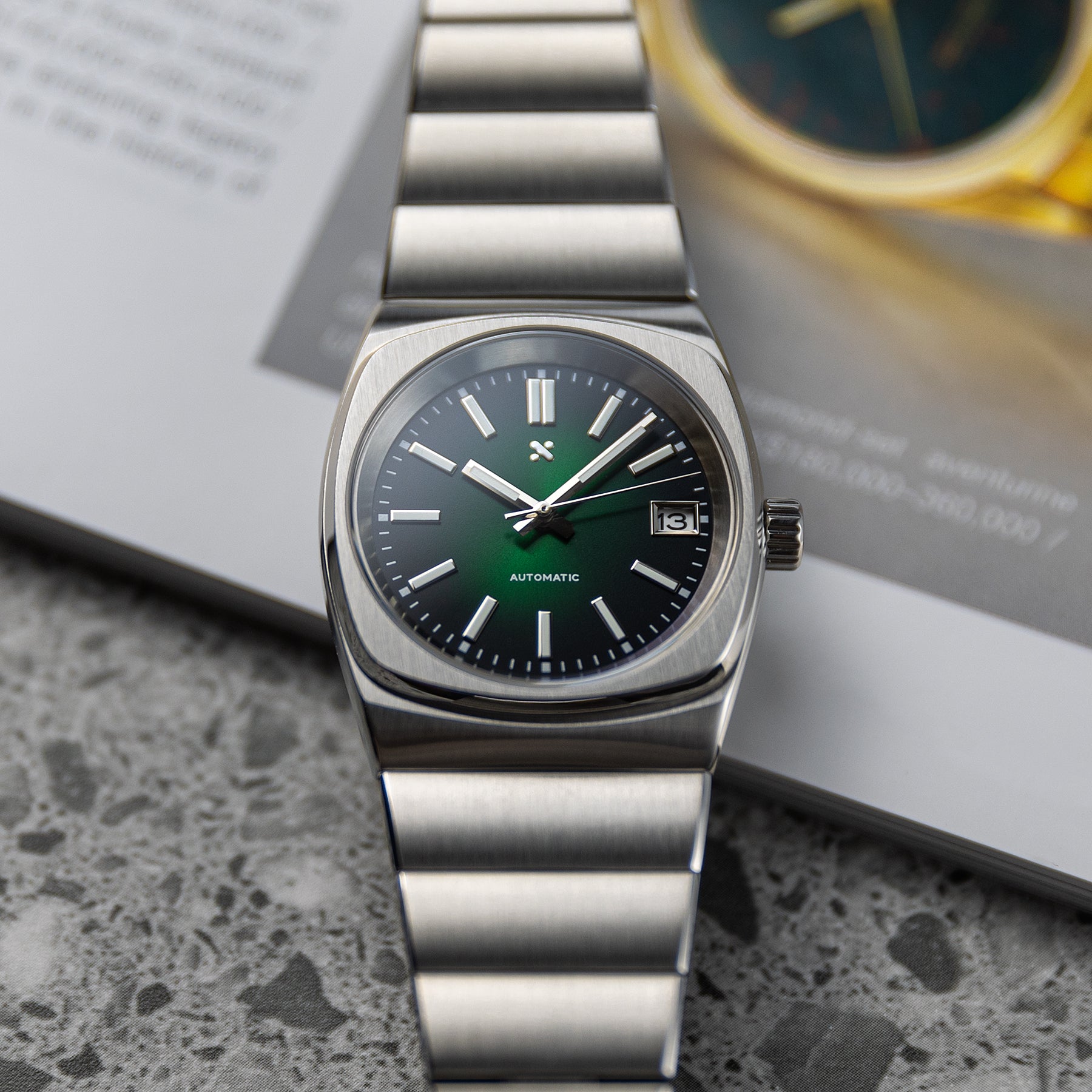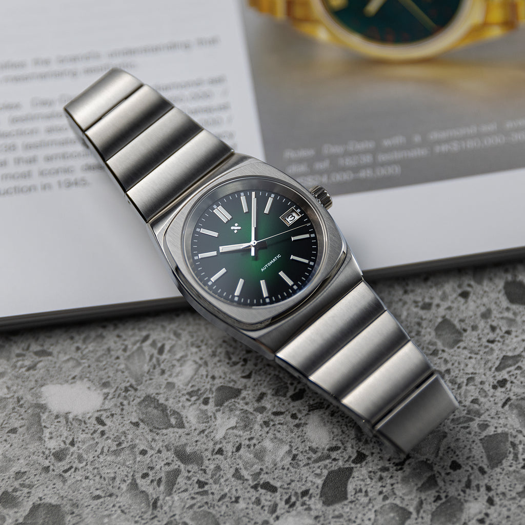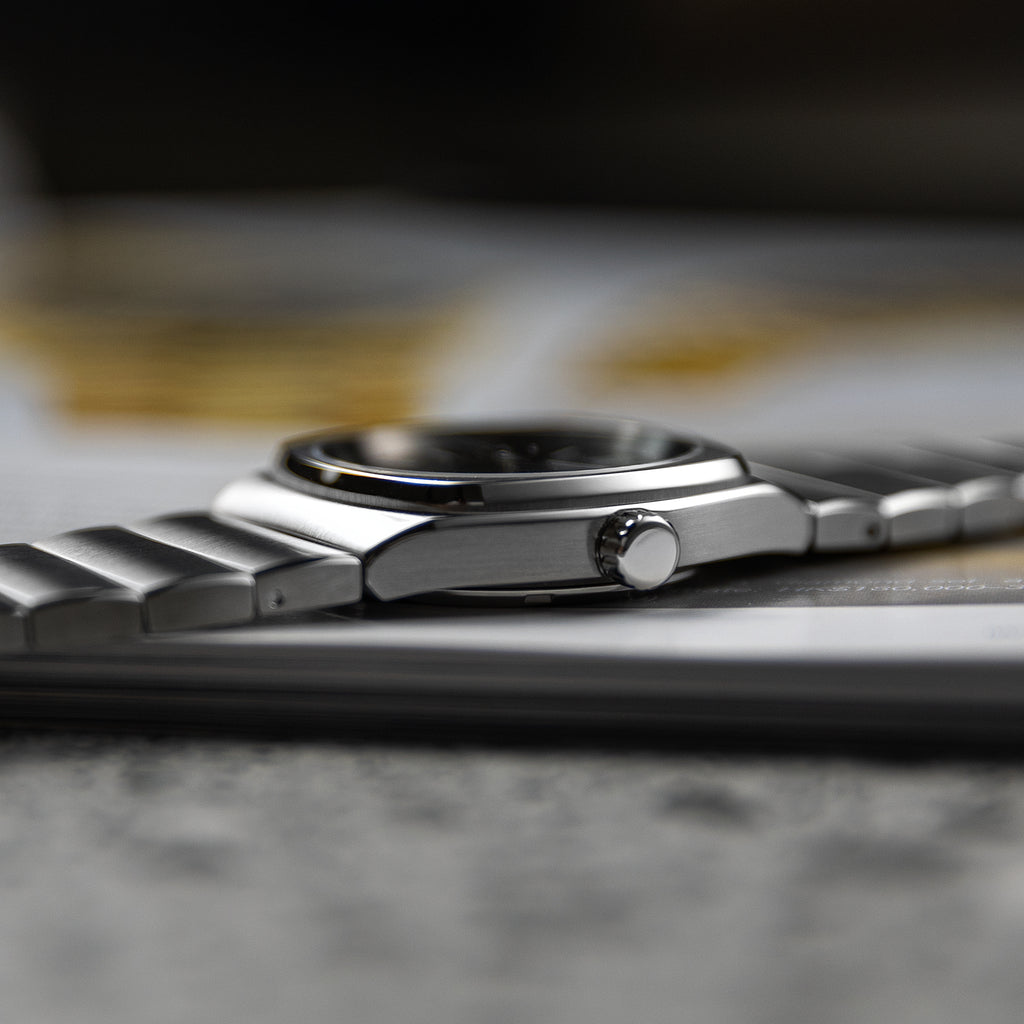 The integrated vintage "ladder" style bracelet completes the look, seamlessly blending into the case to create a streamlined silhouette. Don’t be fooled by its 36mm case size—thanks to the integrated bracelet, it wears larger on the wrist, making it comfortable for most wrist sizes. At just 10.35mm thick with the crystal and slim caseback installed, it's one of our slimmest designs yet!