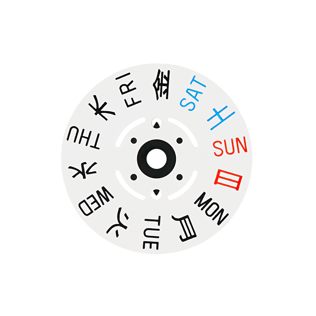 Trying to swap out your 7s26 for an NH36A in a 4 o'clock case? Building a mod with NH36A in a 4 o'clock crown case, and having day wheel misalignment issues? This Kanji Day Wheel Disc will be perfect for you.