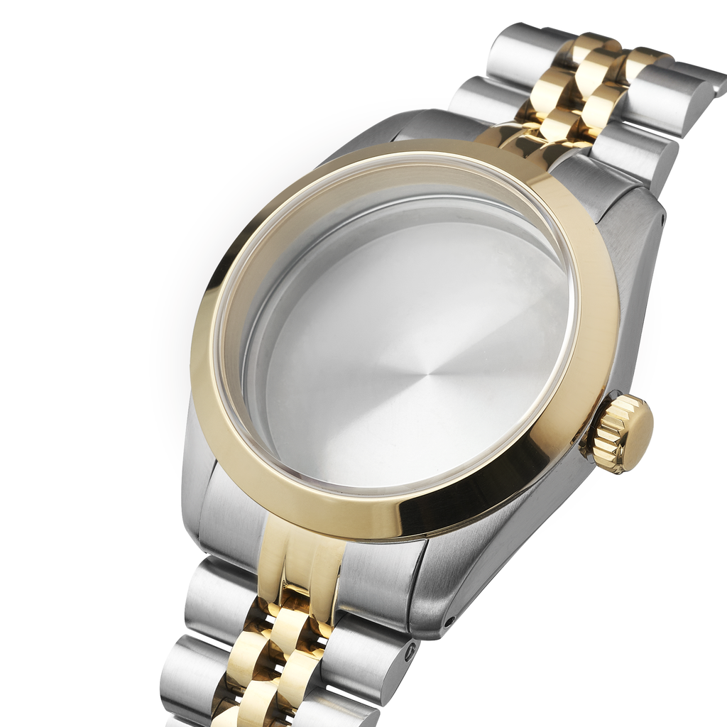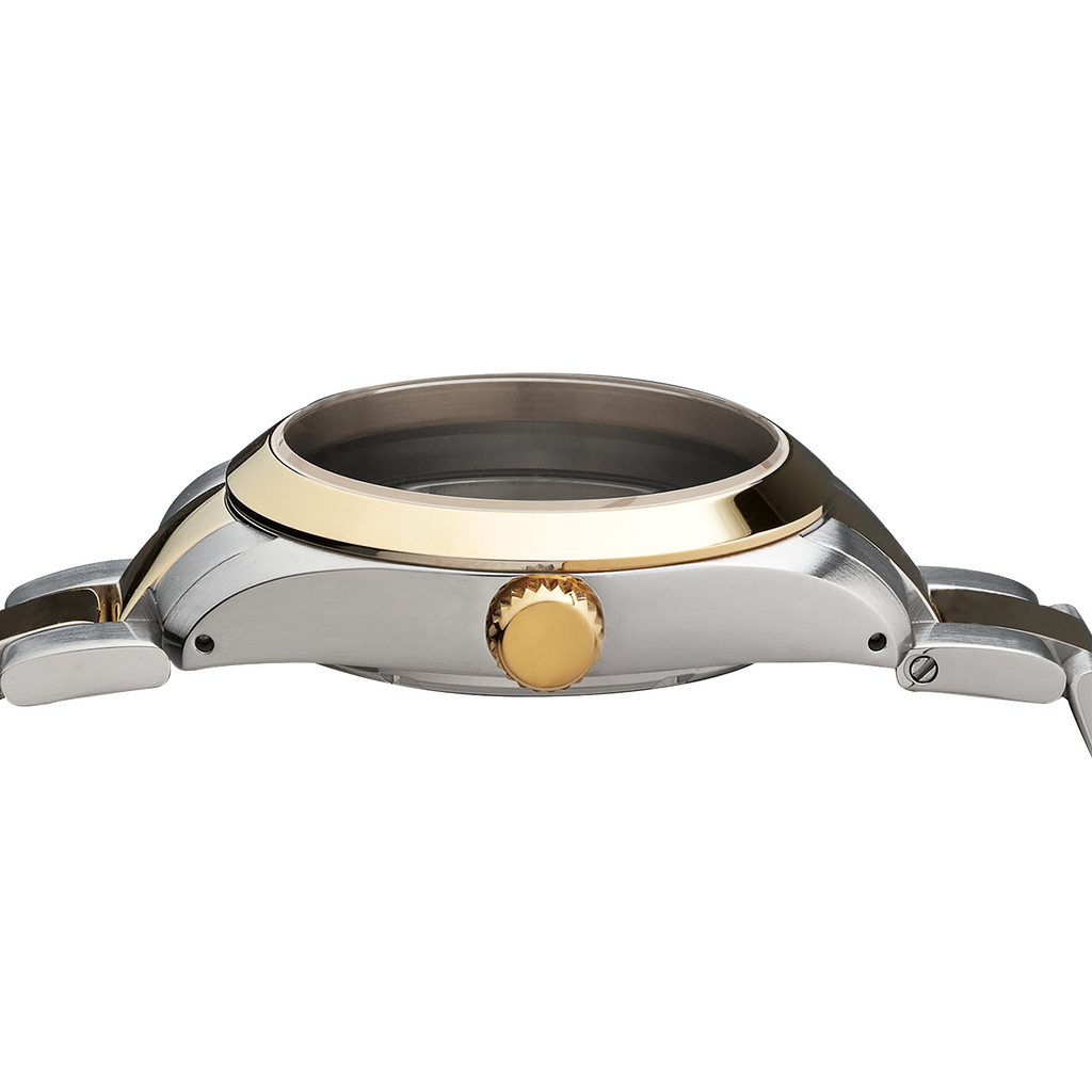 Sleek, handsome, classic. The NMK936 36mm Explorer Case Bundle: Two-Tone Gold Finish is a perfect plug-and-play case for anyone getting into the hobby - just pick your choice of dial and hands, install it onto a NH35/36 movement and presto! Your very own custom tool/field/dress watch build.