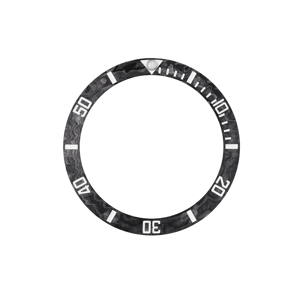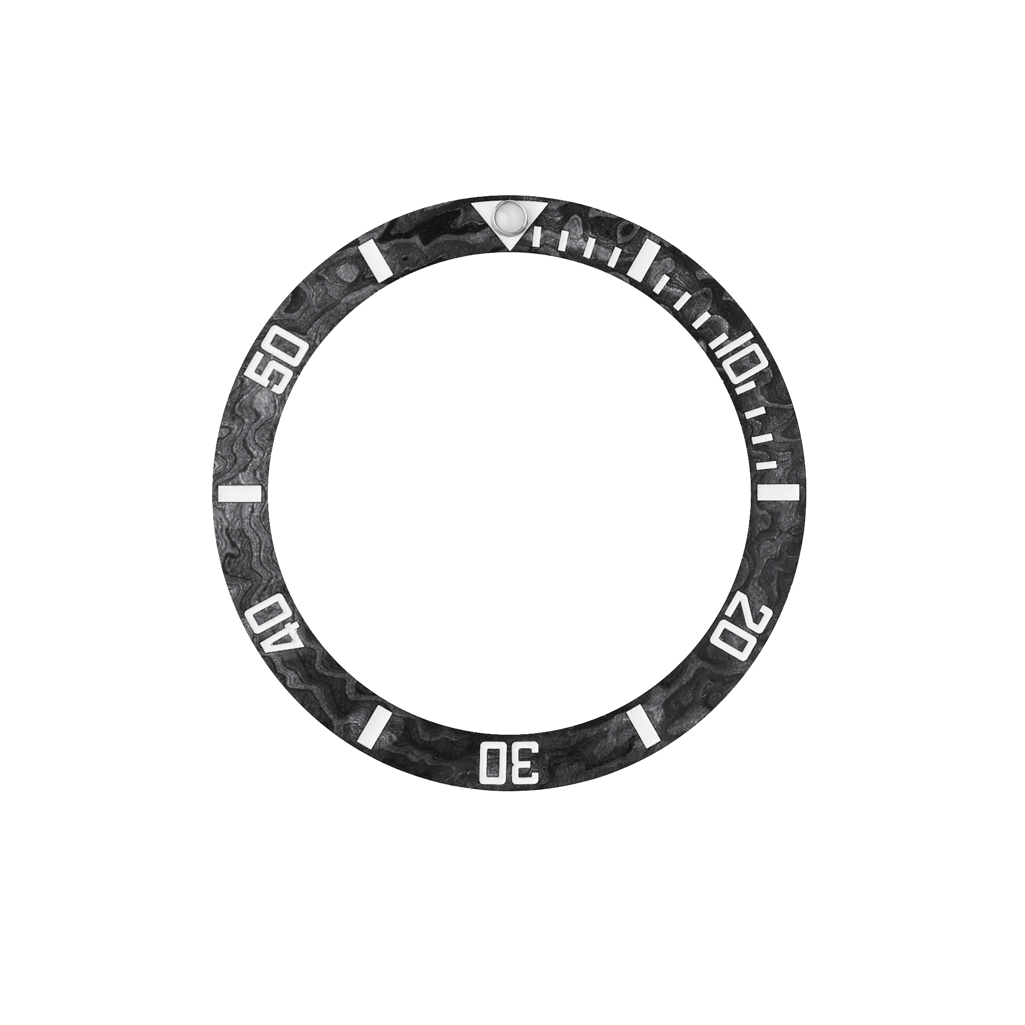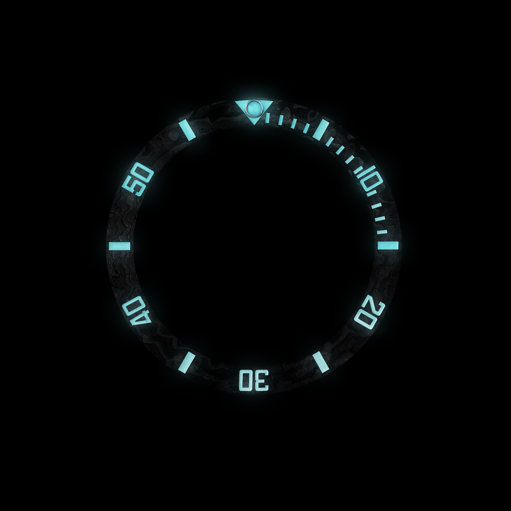 This is a sloped bezel insert and comes in a smooth, matte Forged Carbon finish and is filled with BGW9 (Blue) Super-LumiNova® Lume.