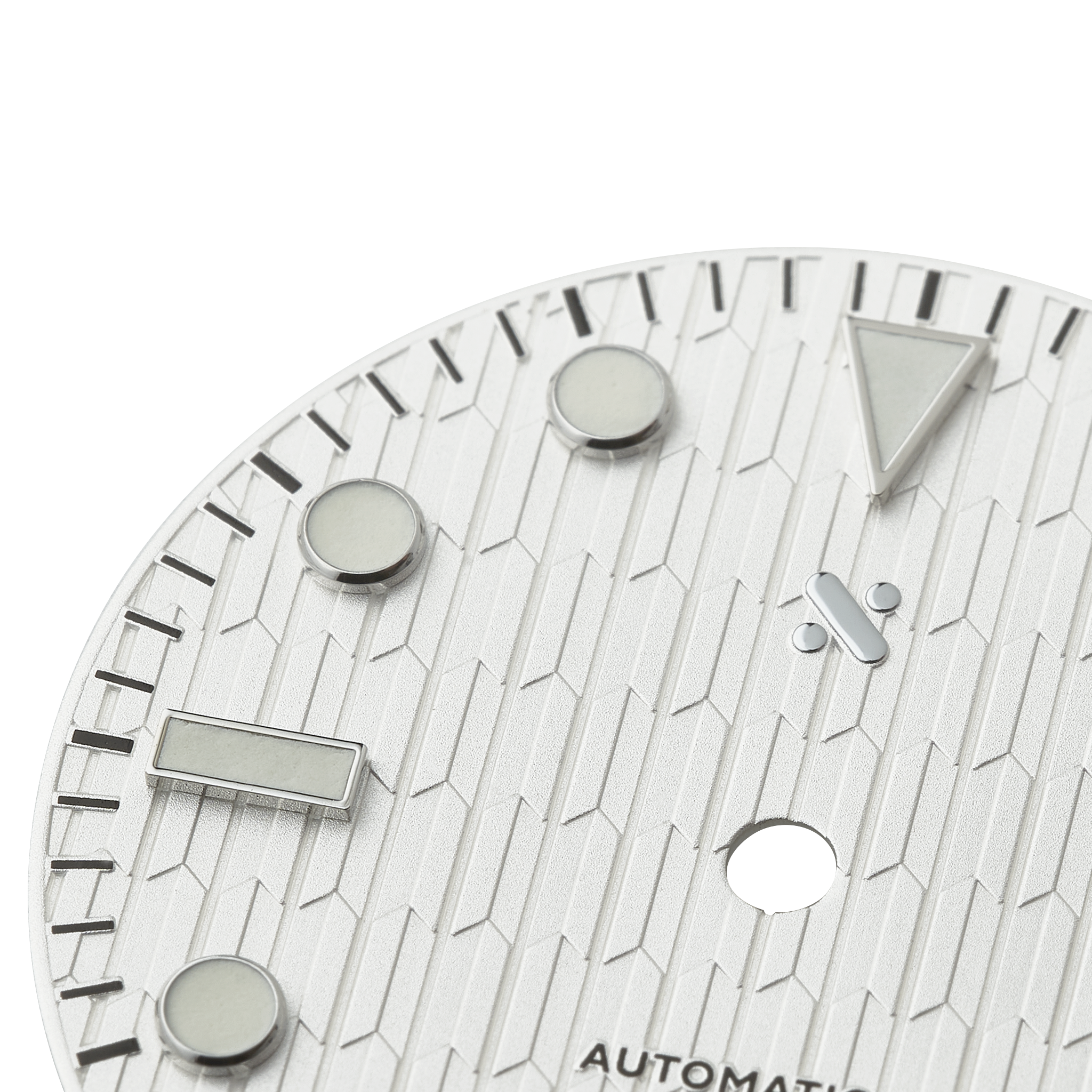 Our Arrow Dial in Silver strikes the perfect balance between precision and elegance. Inspired by traditional Japanese patterns, this bold, directional design features deep embossing that gives the arrow motif striking depth without overwhelming the dial, it's a subtle yet eye-catching detail!