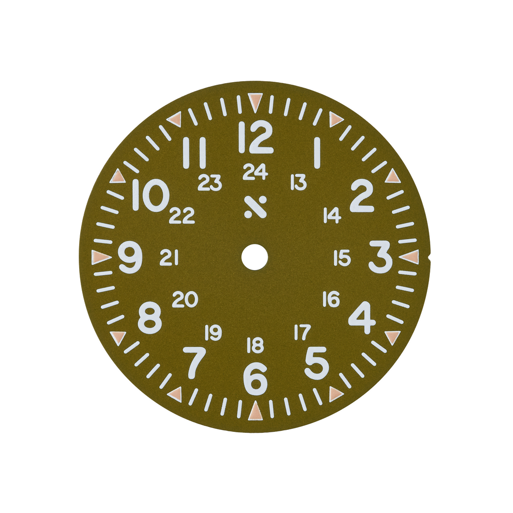 Inspired by classic American Mil-Spec, this Khaki Field dial in Olive Green is a modern take on vintage government-issued military watches from the 60s such as the iconic "GG-W-113" and "MIL-W-3818B". It even has a creamy patina vintage lume that matches our range of Khaki Field hands perfectly!