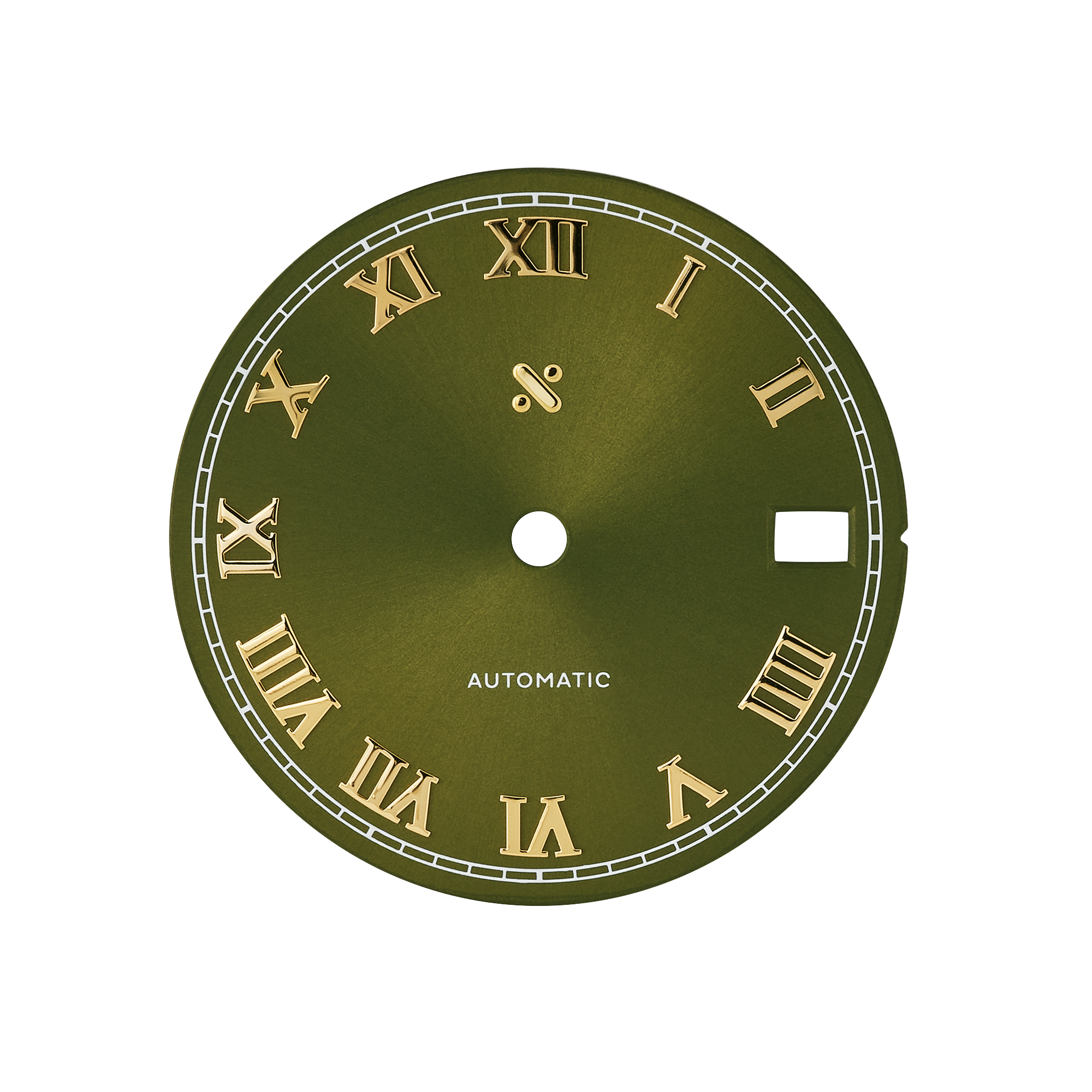Add a touch of timeless sophistication to your watch build with our DJ Dial in Olive Green. The rich olive backdrop, paired with polished gold Roman numerals, exudes classic vintage charm and modern elegance all in one. The sunburst finish creates a captivating play of light, giving this dial a refined character that fits effortlessly into any dress watch collection.