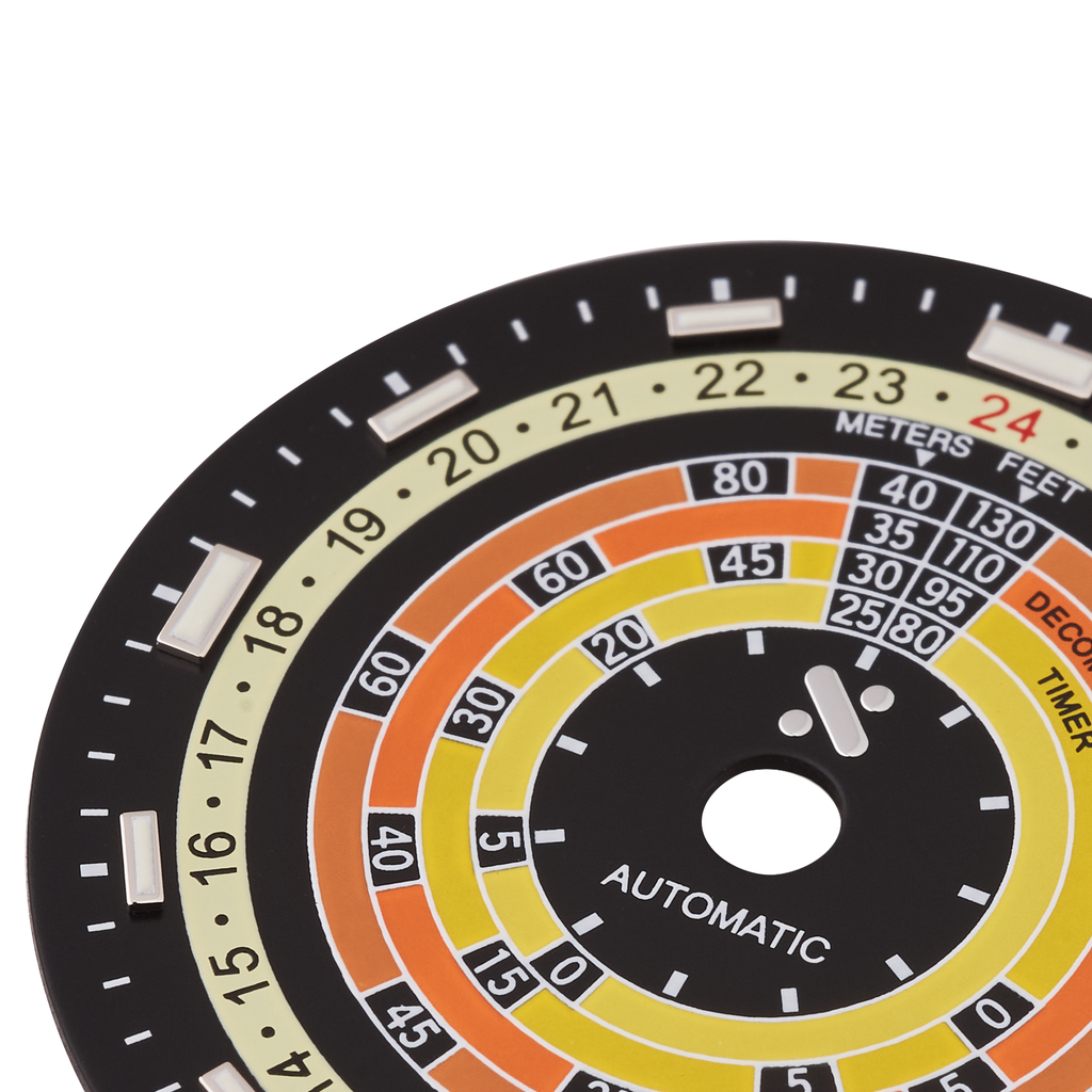 This Worldtimer dial is filled with C3 Super-LumiNova® Lume. C3 Super-LumiNova Lume is the brightest of all lume colours, topping the Super-LumiNova table at 100% relative brightness and giving off a bright, green glow that typically lasts for 7 to 10 hours. It will match the stock Seiko LumiBrite hands and any of our watch hands options perfectly.