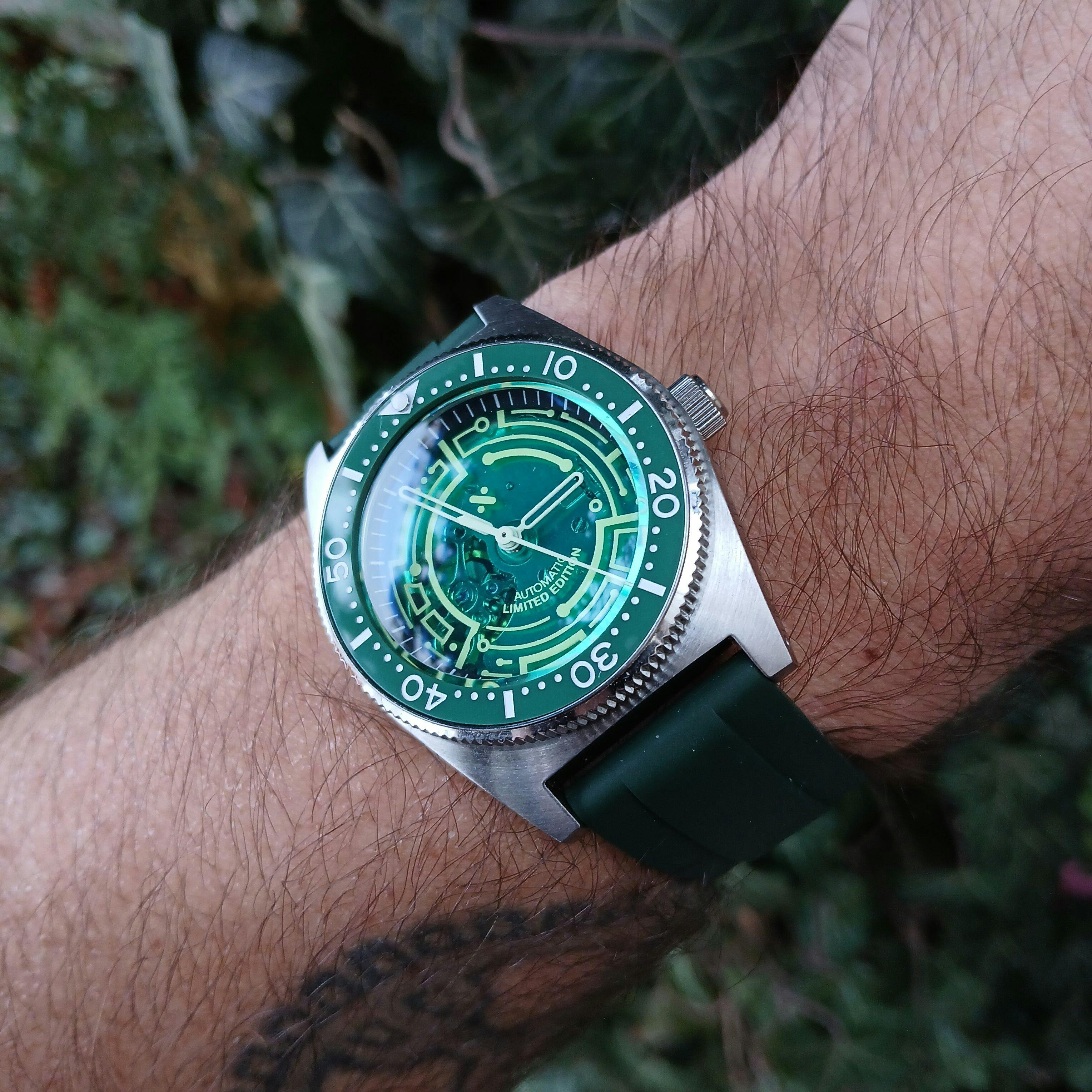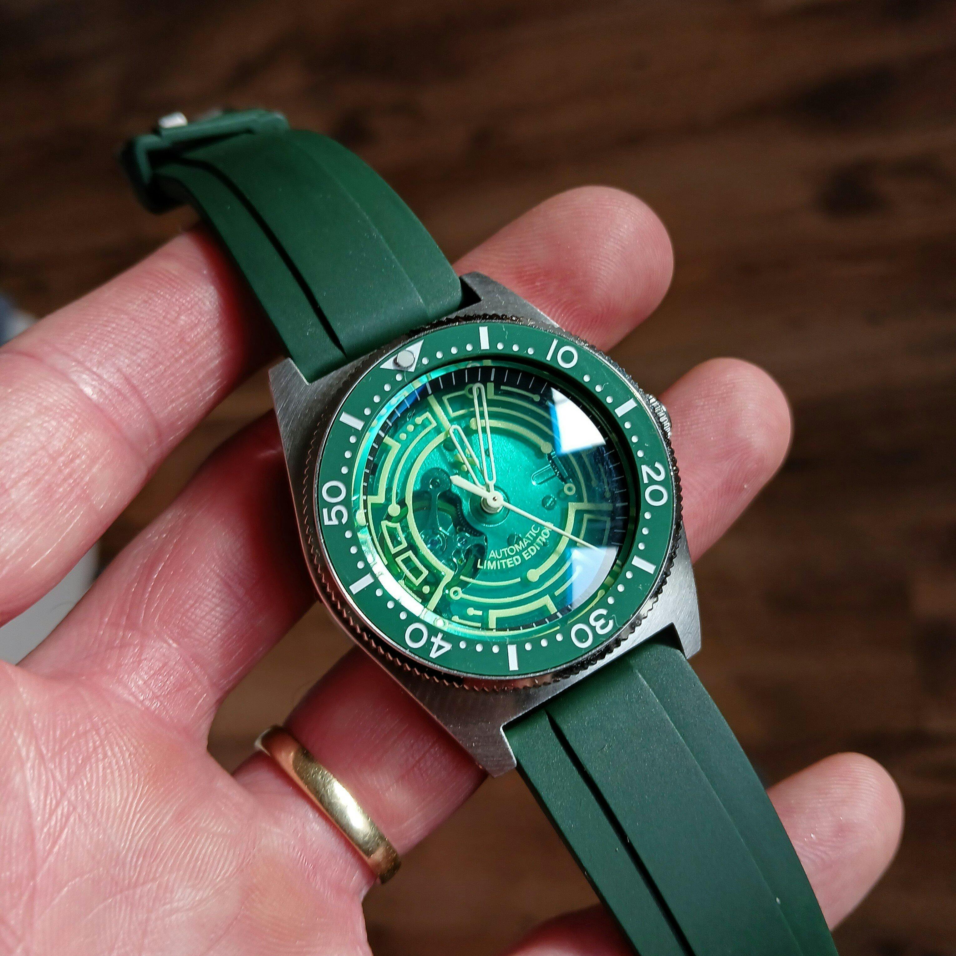 Estamos muy publicitados sobre este tablero de circuito de un estilo Tron de un dial que está hecho de vidrio y viene en verde y negro translúcido, con una fecha y variantes sin fecha.