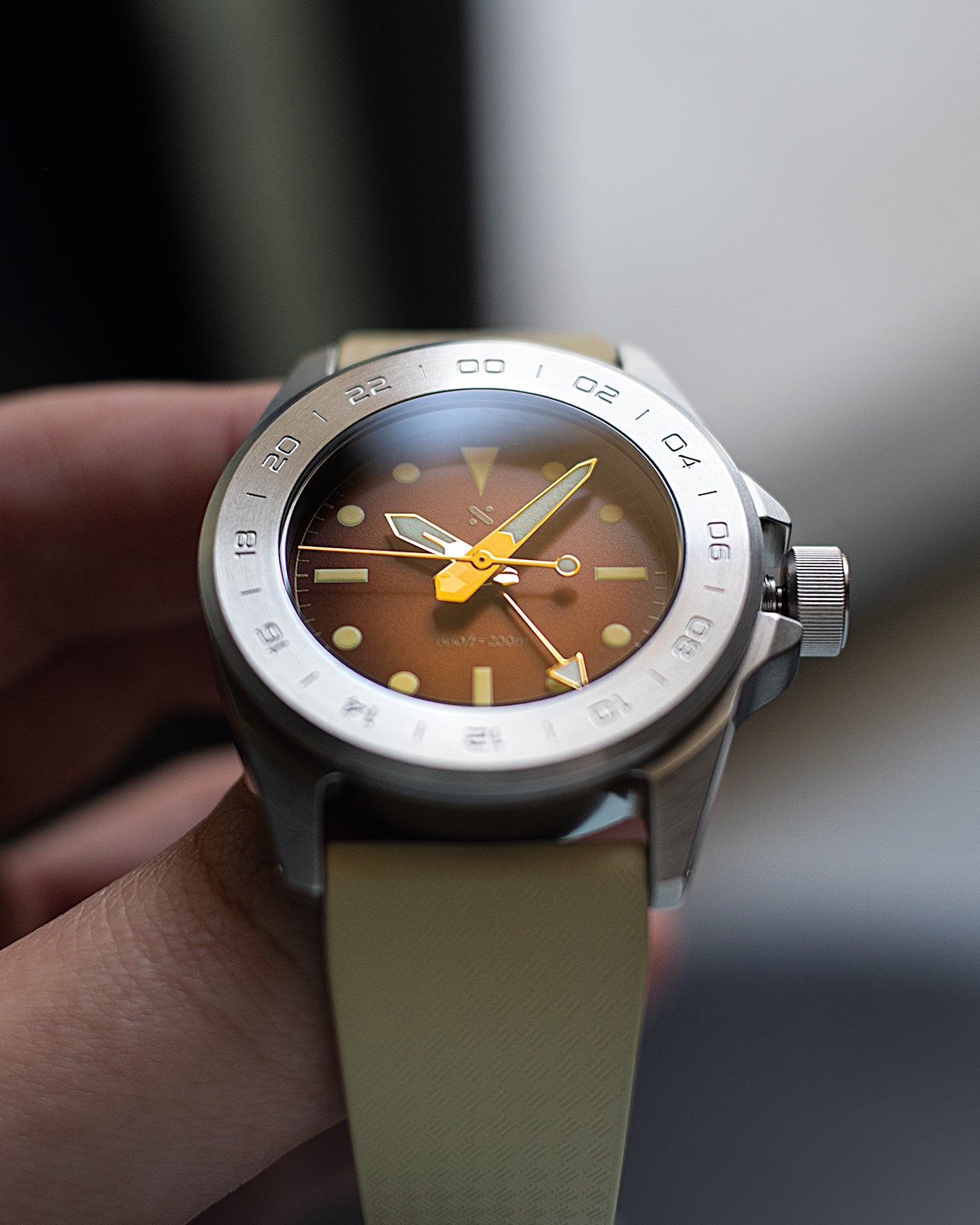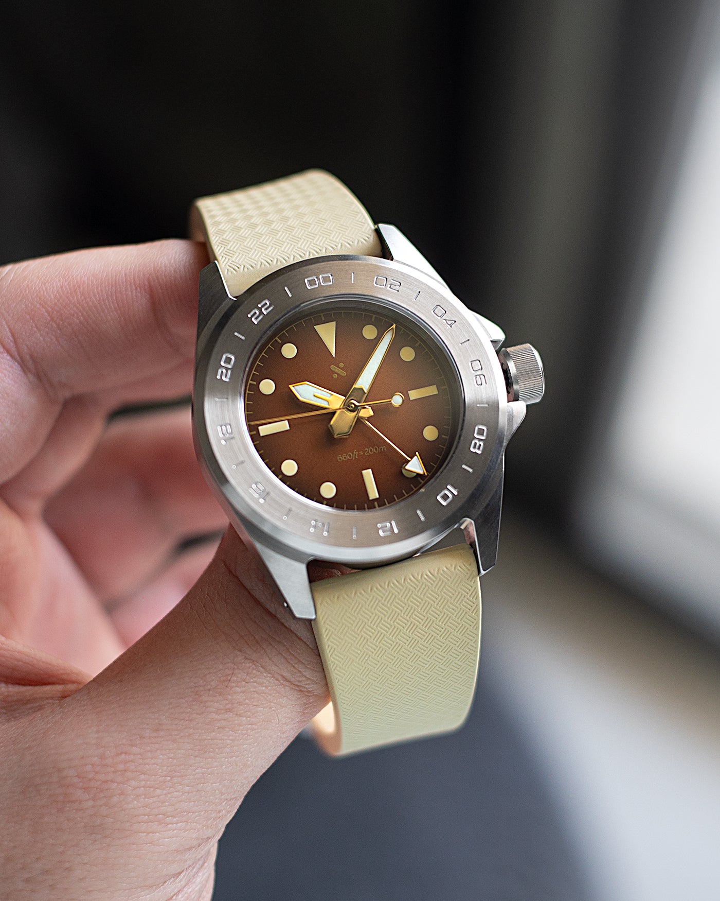 At 40mm wide with a 49mm lug-to-lug and straight drilled lugs, it wears planted and balanced, offering plenty of dial real estate for bold GMT handsets and legible, travel-focused layouts. The oversized 8mm screw-down crown is easy to grip even with wet or gloved hands, keeping the same rugged, military-inspired feel while making quick time and timezone adjustments an absolute breeze.